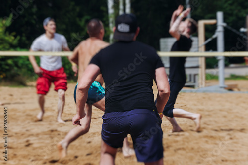 Beach volleyball game, team of adult friends athletes play volleyball by the sea, players on the outdoor playground with net, white sand court field, sports team during the game, in a summer sunny day