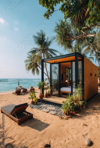 beach, cabin, retreat, beachfront, vacation, luxury, modern, minimalist, wooden, ocean, sand, palm, tropical, paradise, relaxation, quiet, peaceful, secluded, private, cosy, comfortable, stylish, design, contemporary, solitude, calmness, sun, sunbed, lounge, plant, decor, interior, exterior, hut, get-away, nature, idylli, escape, oceanfront, accommodation, travel, holiday, relax, rest