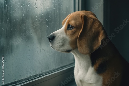 Beagle dog looking out rainy window indoors feeling thoughtful
