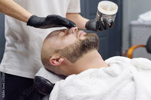beard modeling in Barber shop, beard care for men, male beauty and care concept, applying the scrub to the face