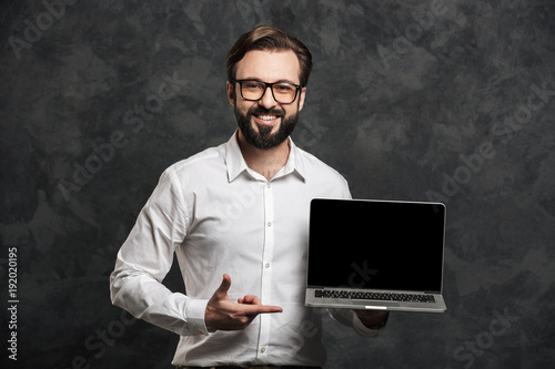 business, people, adult, arm, attractive, background, camera, casual attire, caucasian, clothing, confidence, copy space, ethnicity, lifestyle, looking, male, man, 1, only, part, person, portrait, posing, shirt, shot, laptop, holding, studio, view, white, young, grey, grey, wall, happy, cheerful, smiling, using, typing, cyberspace, network, showing, display, empty