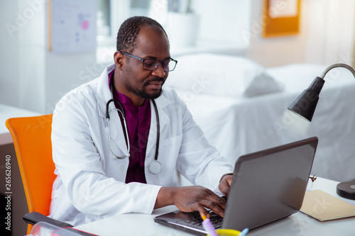 Bearded dark-skinned medical scientist working on laptop