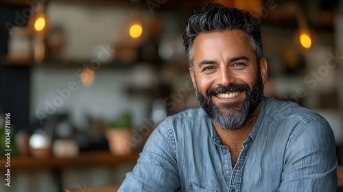 Bearded gay man with a genuine smile, candid shot in a cozy cafe, warm lighting, relaxed and friendly atmosphere, open and approachable expression