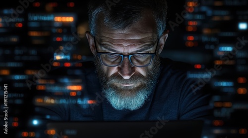 Bearded man deeply focused while coding in a high-tech cybersecurity office