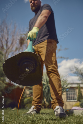 Bearded man in casual clothes and gloves is trimming green grass with professional electrical mini lawn mower on his backyard. Sunny day. Close up
