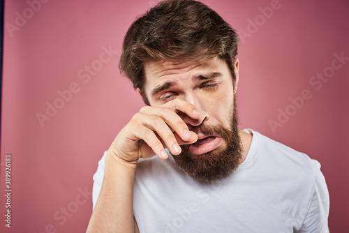 bearded man in white t-shirt emotions displeased facial expression studio pink background