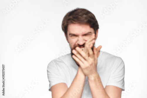 Bearded man in white t-shirt gesture with hands emotions light background