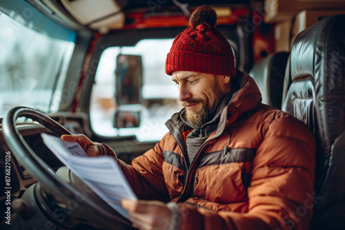 Bearded man in winter clothing reading document inside a truck cabin