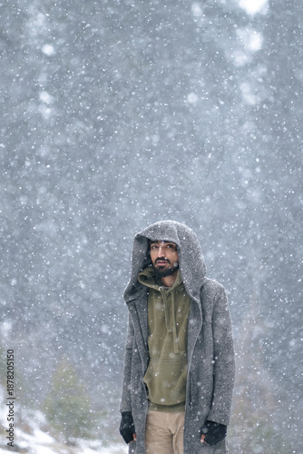 man, winter, snow, snowfall, blizzard, cold, weather, outdoors, forest, mountain, nature, travel, adventure, survival, solitude, pensive, bearded, male, portrait, hooded, jacket, coat, glove, apparel, fashion, lifestyle, seasonal, holiday, glacé, chilly, white, grey, moody, atmospheric, cinematic, wanderlust, landscape, endurance, peace, wilderness