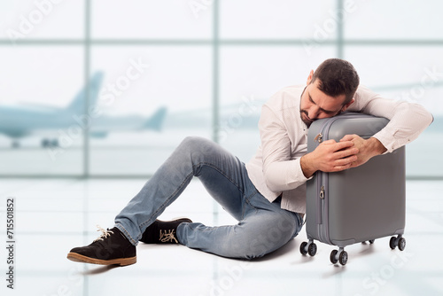 Bearded man sitting on the floor and hugging his travel bag asleep and tired of waiting in an airport. Long waiting lines. Flight delays. Despair over cancelled flights