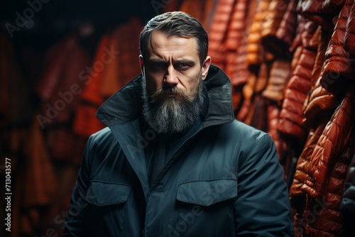 Bearded Man Standing in Front of Meat Rack in Grocery Store