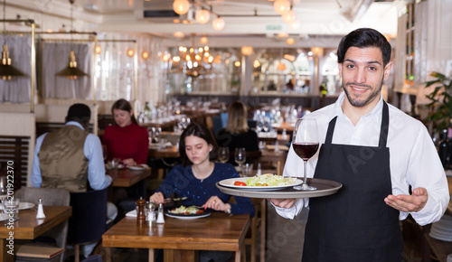 man, waiter, eatery, hall, portrait, holding, tray, order, dish, drink, offering, tasting, meeting, invitation, gesticulate, guest, visitor, people, ethnicity, argentine, adult, male, emotion, expression, success, smile, cheerfulness, enjoying, polite, hospitable, confident, expertise, occupation, activity, engagement, working, job, employee, business, kitchen, food, service, appearance, unshaved, elegant, apron