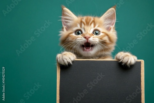 Beast holding sign ad. Сute cat turkish angora hold in front paws a template - large dark black road sign. Pet street ad. Isolated baby feline on a solid attire green background. Cat promo i.