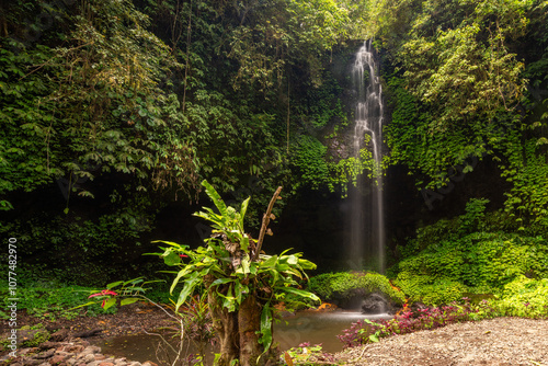 Beatiful waterfall and flowers in North of Bali, Indonesia
