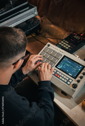 Beatmaker in a studio producing some music with an Akai MPC LIVE II