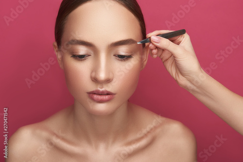 adult, woman, girl, young, beautiful, face, attractive, beauty, isolated, caucasian, sensual, person, pretty, shoulder, lady, pink, background, skin, naked, closeup, portrait, female, naked, serene, hand, arm, calm, tweezer, pluck, eyebrow, correction, cosmetic, tool, hygiene, care, shape, pincer, cosmetologist, finger
