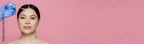 Beautician holding syringe near face of asian woman with naked shoulders isolated on pink, banner