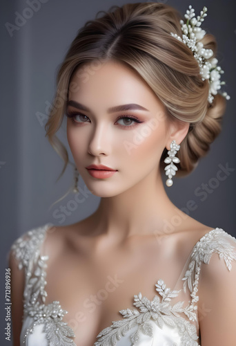 Beautiful beautiful bride model woman with beautiful hairstyle and makeup in elegant wedding dress fashion
