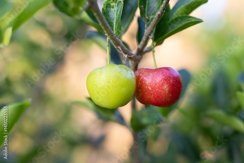 Beautiful 2 Cherry fruit one in green and one in red found in the cherry plant