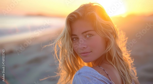 Beautiful 25 year old blonde woman at the beach, around sunset.
