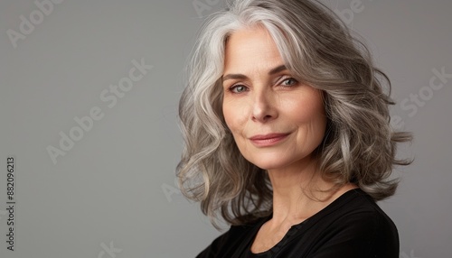 Beautiful 60-Year-Old Woman with Graceful Demeanor, Shoulder-Length Softly Curled Silver Hair Framing Face