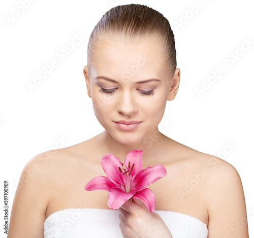 woman, spa treatment, human face, single flower, beautiful, health spa, well-being, human skin, fashion model, smiling, flower, spa, smelling, female, sensuality, white, people, happiness, freshness, closeup, young adult, scented, one person, clean, cute, bodycare, lily, white background, aromatherapy, studio shot, holding