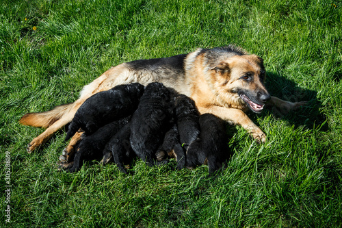 beautiful adult german shepherd female feeds small puppies