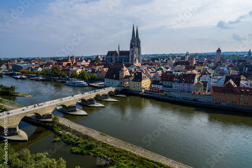 Beautiful aerial view of Regenesburg, its massive gothic St Peter cathedral, the Danube river and the Old Stone Bridge