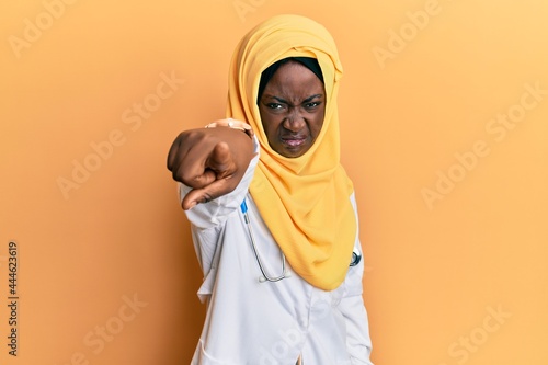 Beautiful african young woman wearing doctor uniform and hijab pointing displeased and frustrated to the camera, angry and furious with you