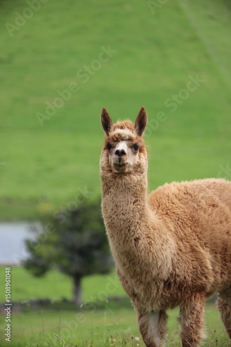 Beautiful Alpaca in country green background, domestic animal photography