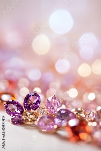 Beautiful amethyst and pink gemstones jewelry sparkling on a golden background with bokeh effect, vertical, copy space