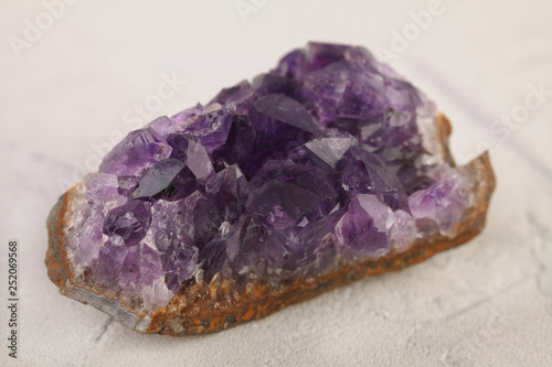 Beautiful amethyst druse close-up on white cement background. Semi precious gem used for jewels.