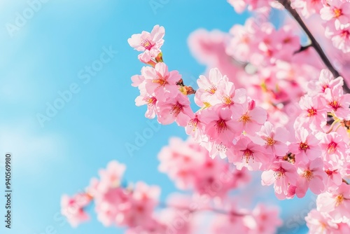Beautiful and cute pink Kawazu Zakura (cherry blossom) against blue sky, wallpaper background. Tokyo, Japan , ai