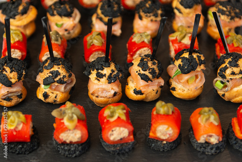 Beautiful and delicious snacks with salmon on black surface. Closeup view.
