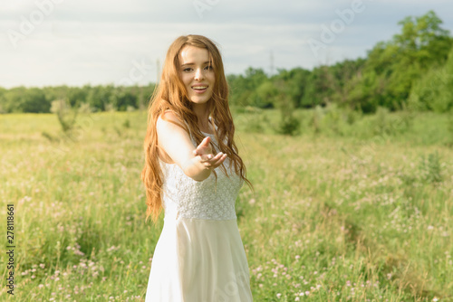 Beautiful and happy young girl running on the green field in a white dress
