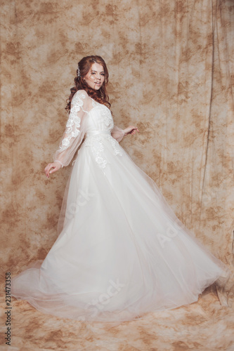 Beautiful and romantic bride in wedding dress with long sleeves. Young redheaded woman in wedding dress