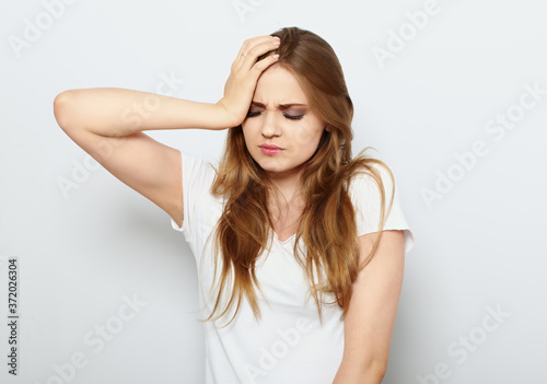 Beautiful angry unhappy thinking woman holding the hand with headache and raised eyebrow on blue background. Closeup portrait