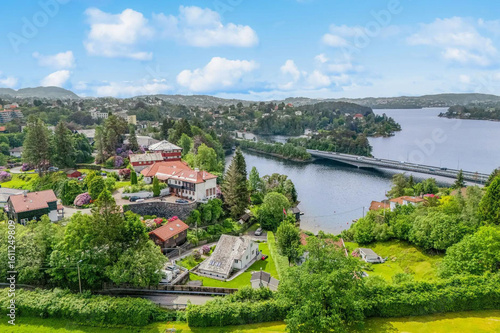 beautiful areal view of typical norwegian village from above with luxury villas sea fishermen's houses and boats. fishing village