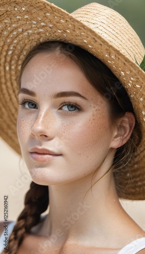beautiful aring ng freckled woman straw hat girl face young woman spring bright summer holiday freckled teenage gardener attractive looking hat shy red 1 eye head cute hair skin spot teenage straw