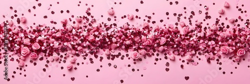 Beautiful arrangement of pink roses and heart-shaped confetti on a soft pink background