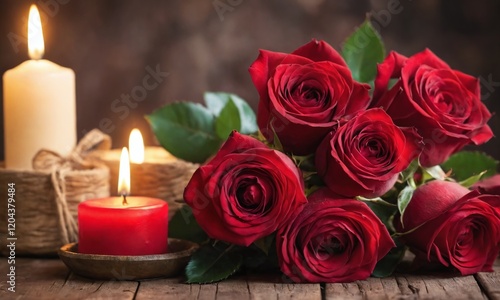 Beautiful arrangement of red roses with candles creating a romantic atmosphere for a special occasion. Valentine’s Day, date, engagement, love, wedding, background