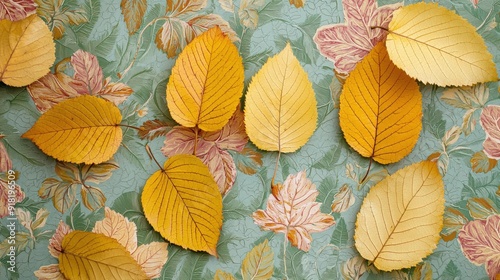 Beautiful arrangement of yellow leaves on floral background, perfect for seasonal themes and nature-inspired designs.
