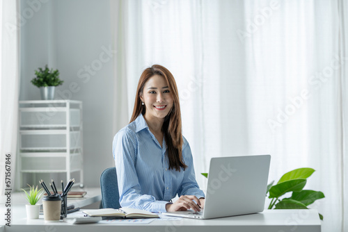 Beautiful Asian businesswoman sitting at work saving data Happy checking financial details on laptop computer in the office.