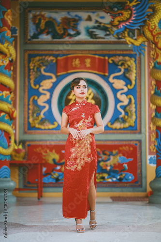Beautiful Asian Chinese Woman Wearing Cheongsam Traditional Red Dress Fashion Posting Chinese Lunar New Year.