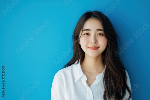 cute, beautiful, long hair, smile, woman, staff, employer, employee, shirt, white, white shirt, asian, girl, turquoise, background, natural, simple, elegance, modern, cheerful, positive, youth, confidence, fashion, casual attire, charming, stylish, trendy, beauty, minimalism, skincare, branding, vibrant, lifestyle, campaign, fresh, happy, radiant, clean, appealing, glowing, serene, minimal, graceful, lovely, model, relaxed