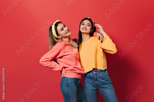 Beautiful Asian girls in sweaters and jeans posing on red background
