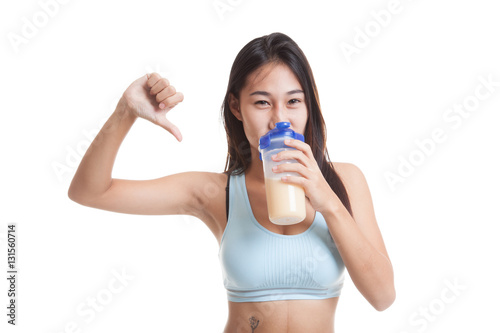 Beautiful Asian healthy girl thumbs down hate whey protein.