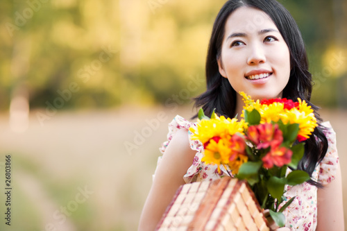 20s, adorable, asian, attractive, beautiful, beauty, black hair, copy space, cute, ethnic, ethnicity, fashion, female, field, flower, girl, happiness, happy, horizontal, korean, lady, long hair, nature, one person, outside, people, portrait, pretty, smile, spring, summer, woman, young adult