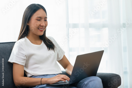Beautiful asian woman using laptop and sitting on the sofa in living room.