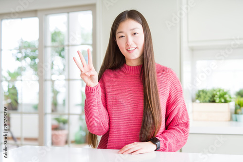 Beautiful Asian woman wearing pink sweater on white table showing and pointing up with fingers number three while smiling confident and happy.